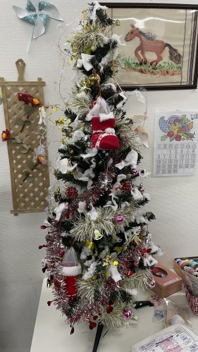 Ⅱ期でのクリスマス飾りでは、クリスマスツリーをメンバー主体となって装飾し、また、壁飾りやペーパークラフトなども作成しました。