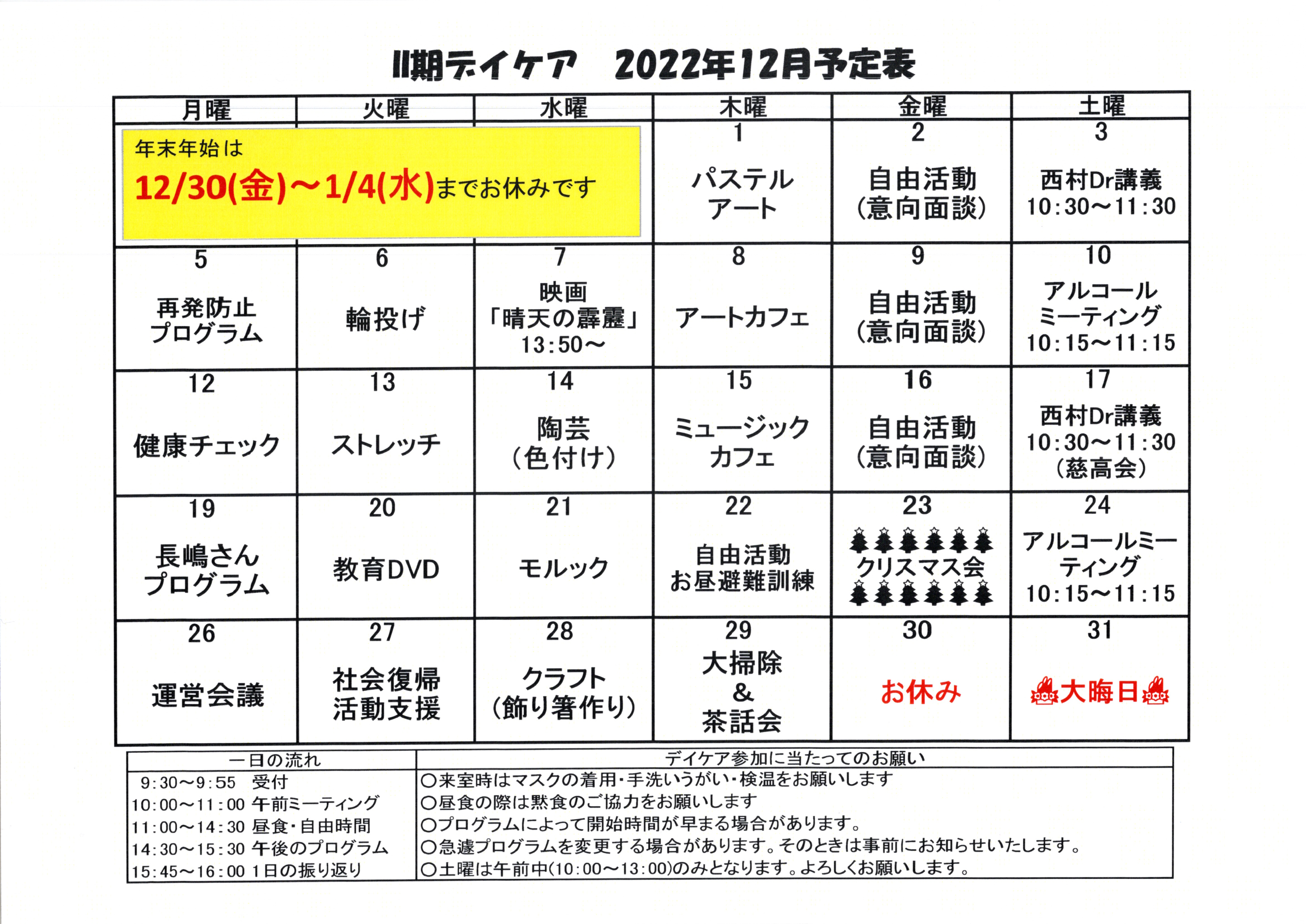 また、12月は自由活動の時間などにクリスマスの小物クラフトも行う予定です。自宅でのクリスマスを彩りを出したい方も、せっかくのクリスマスということで初めての方も是非、取り組んでみてください。